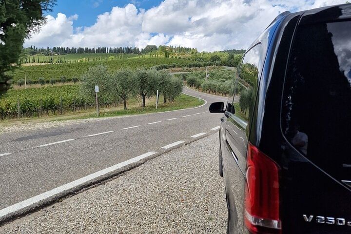 Indulge in the enchanting ambiance of the Tuscan country side as you embark on a journey through rolling hills and pictures of vineyards during your trip from Florence to Rome.